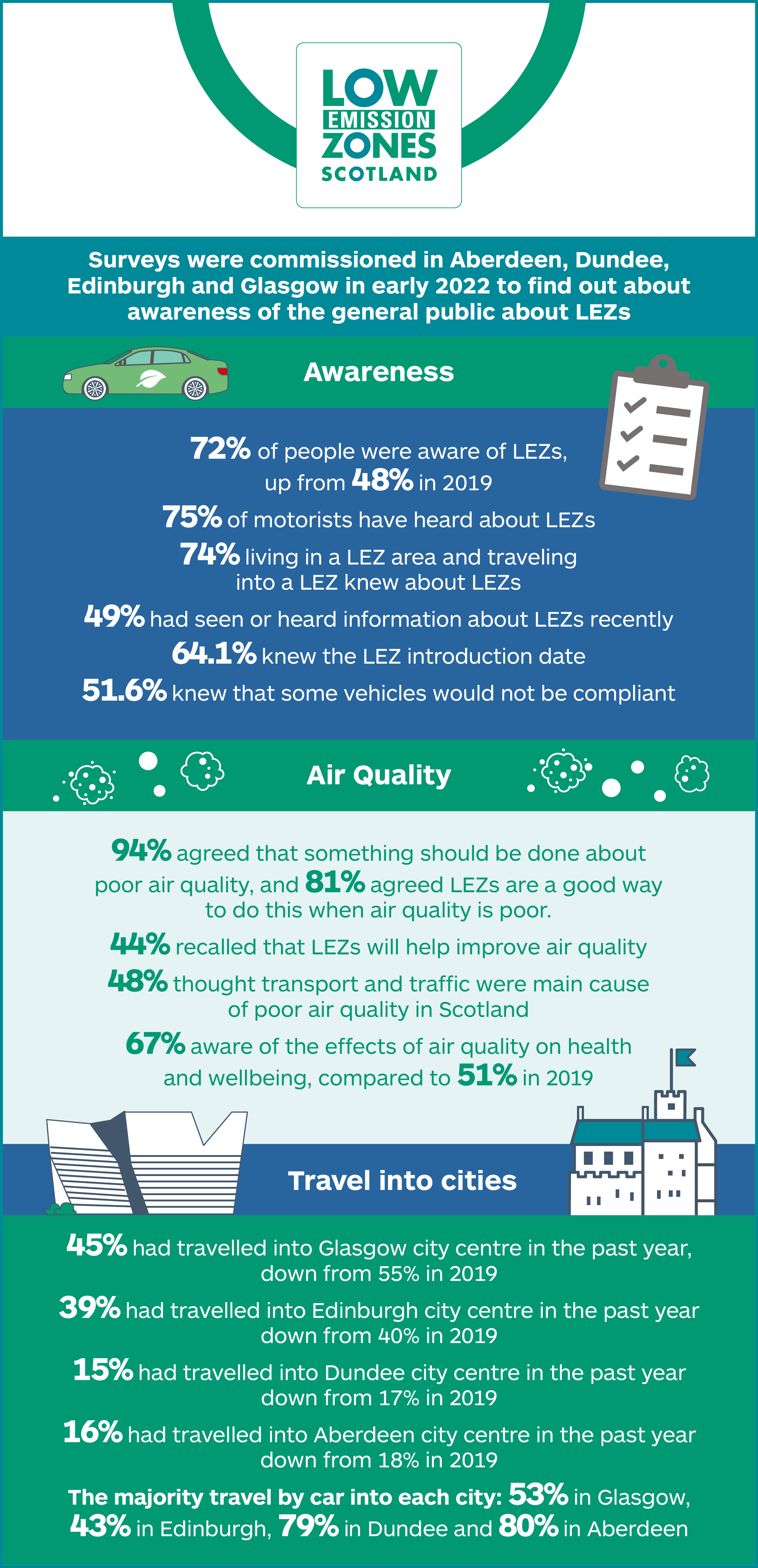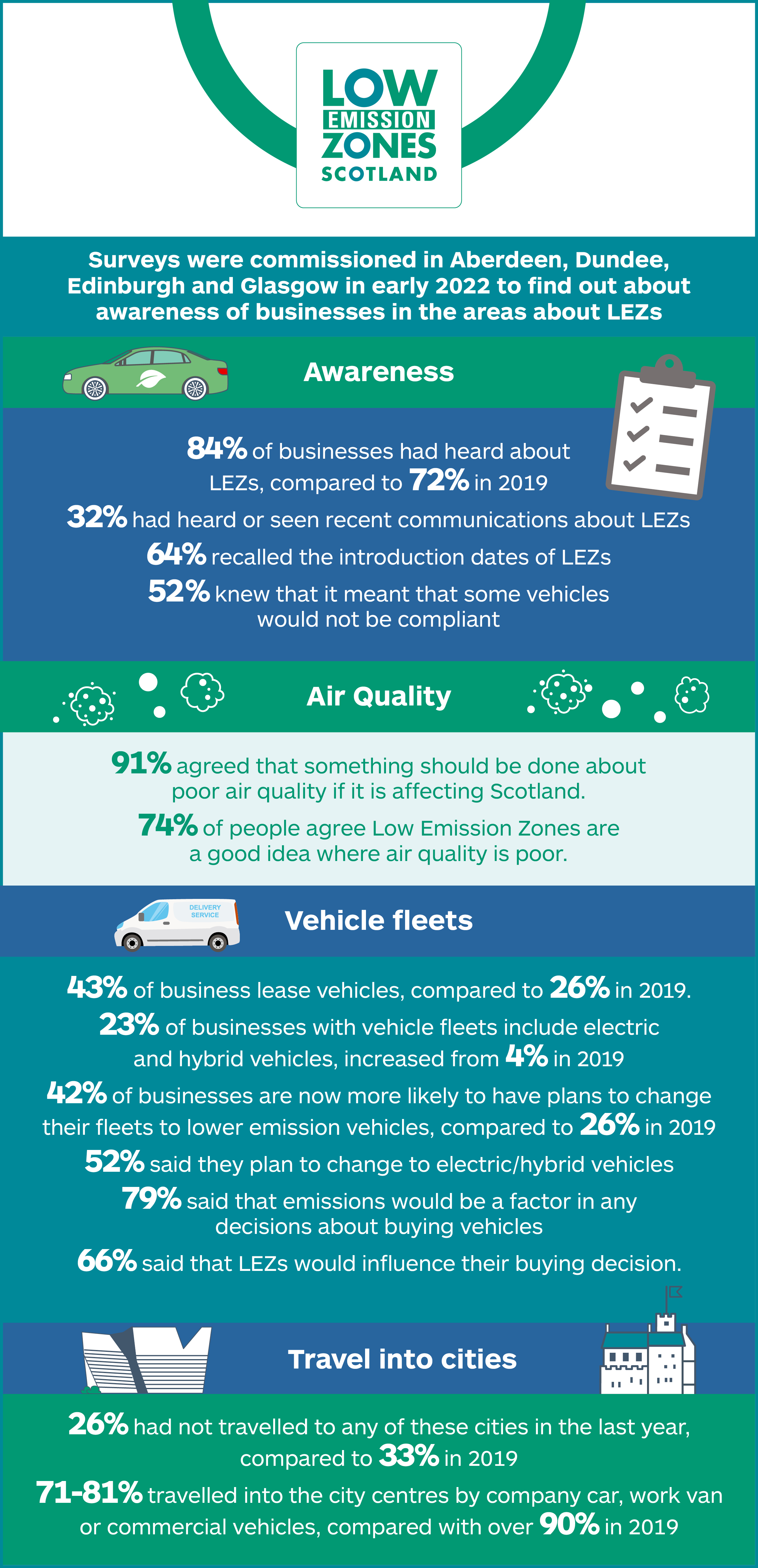 A recent survey, commissioned by Transport Scotland, has revealed a growing awareness of Scotland’s Low Emission Zones (LEZs) with 72% of individuals and 84% of businesses stating that they know about the zones. This compares to 48% and 72% from the initial baseline study carried out in early 2019.